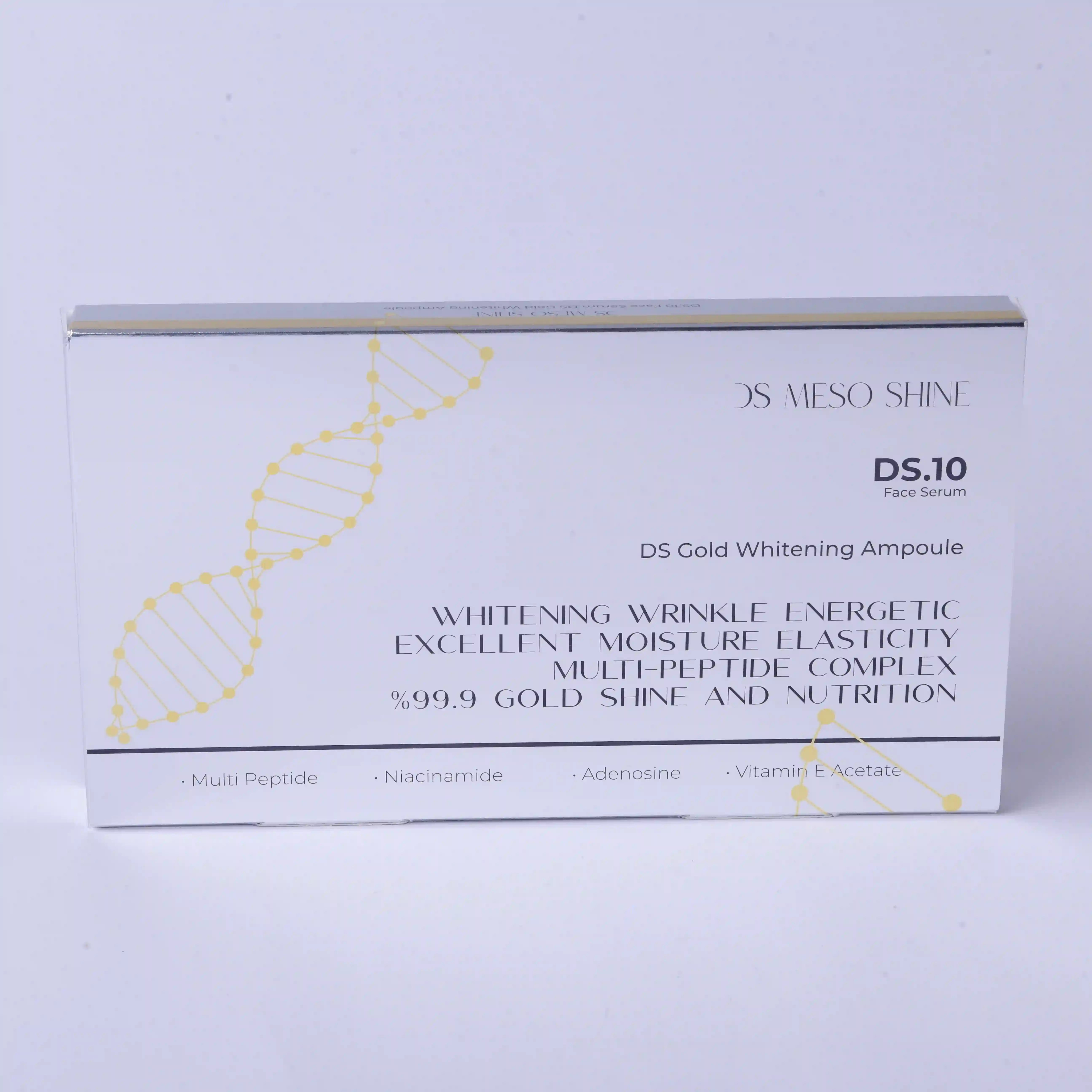 حاوی 10 ویال و هر ویال 5 میلی لیتر می باشد. سرم ۱۰ DS حاوی ۷ عصاره گیاهی است که به همراه ۳ نوع اسید هیالورونیک، کلاژن هیدرولیز شده طلا و پپتیدها پوست را درخشان کرده و ظاهری سالم را تقویت می کند. این مواد به کاهش چین و چروک ها کمک میکنند و از روند نوسازی پوست حمایت میکنند و به یکنواخت شدن رنگ پوست کمک می کنند. علاوه بر این سرم در پوست در برابر استرس محافظت میکند سیاهی زیر چشم را برطرف می کند و مانعی در برابر عوامل مضر محیطی ایجاد میکند خاصیت محافظتی در برابر اشعه ماوراء بنفش دارد آکنه و جای آکنه را تسکین میدهد از ایجاد خطوط و چین و چروک جلوگیری میکند این سرم همه کاره محافظت و مراقبت مورد نیاز پوست شما را فراهم میکند و ظاهری جوان تر و پویاتر ارائه می دهد.